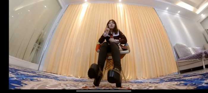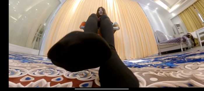 接着抬起巨大的脚进行踩踏、放在椅子上坐压、放进鞋子里,最后强迫舔臭棉袜脚。