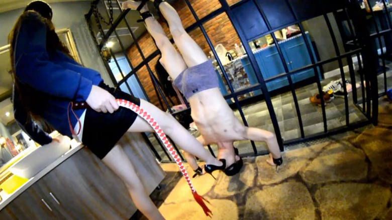 ②把奴隶双脚绑在一起倒吊,鞭打、踢踹、踩脸、鞋尖插嘴