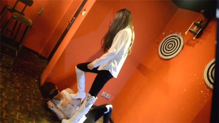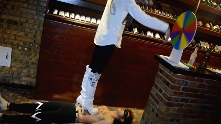 ①在吧台舔靴子、踢头②鞋跟划烂背心、踩踏