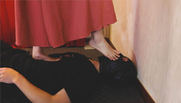 狗奴进门跪拜,踩踏、踩脸、踩裆。然后让狗奴侍奉自己的美足,舔舐、插嘴,还有鞭打